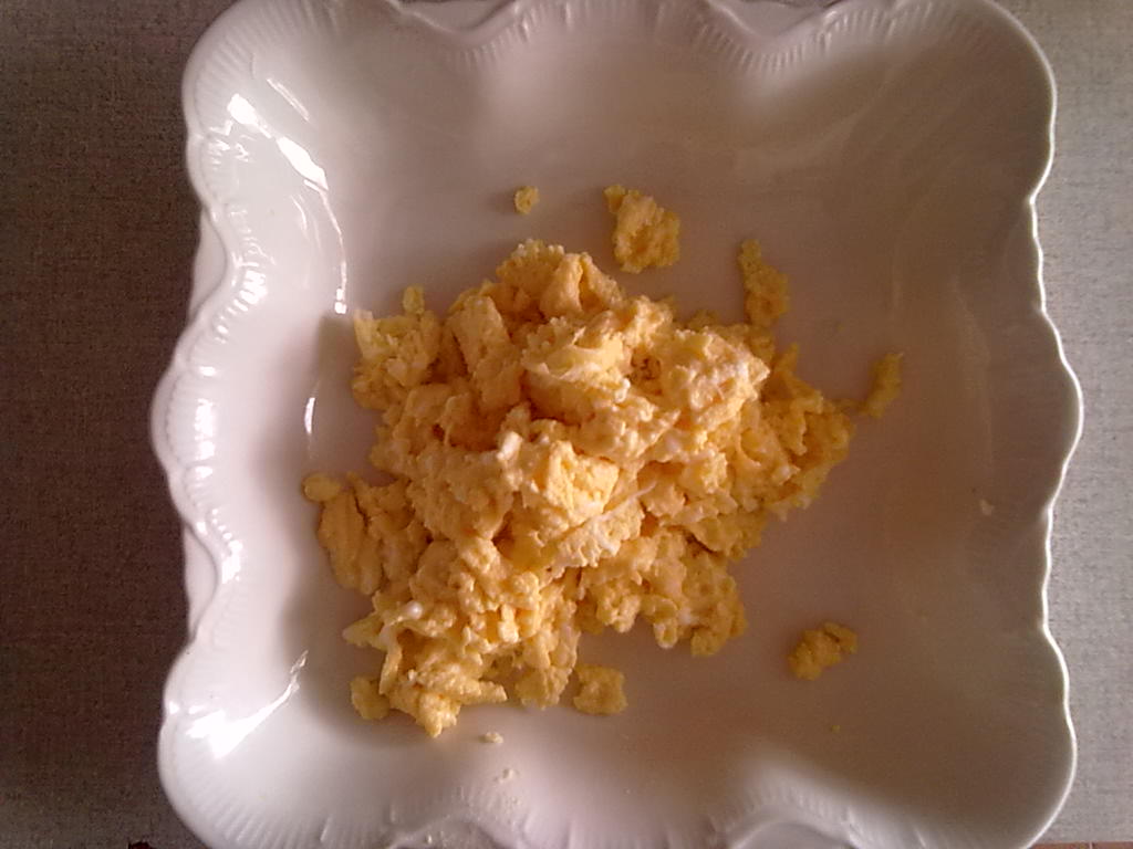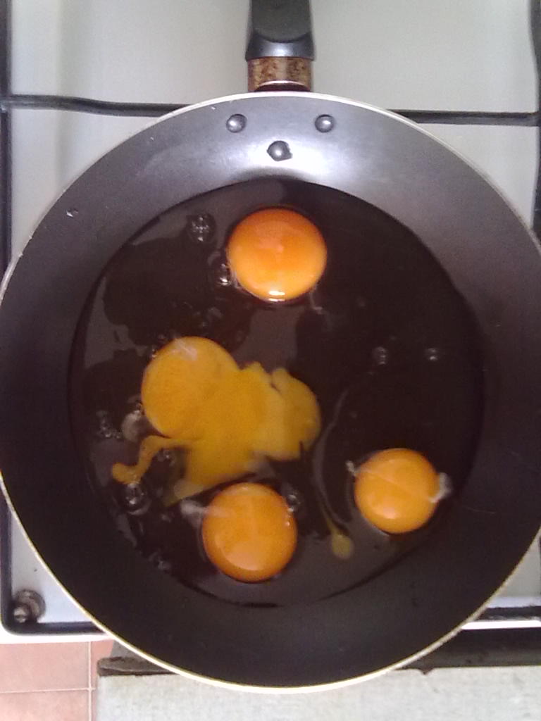 Nachystáme si pánvičku (nejlépe teflonovou), kam přidáme trochu olivového oleje, rozklepneme 4 celá vejce a usmažíme je do konzistence, kterou máme rádi.