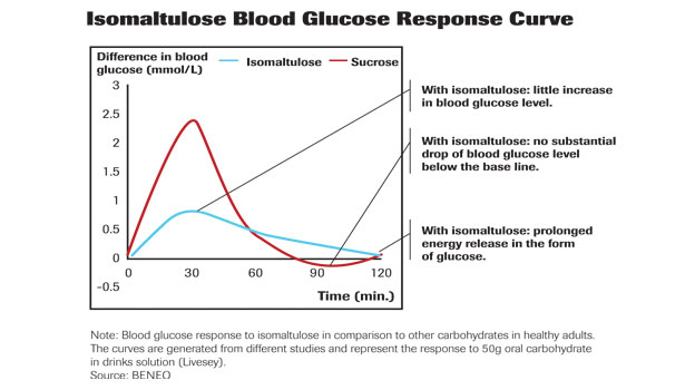 Isomaltulóza se vyznačuje nižším glykemickým indexem, pomalým štěpením, úplným využitím ve střevě a stabilitou v kyselém prostředí.