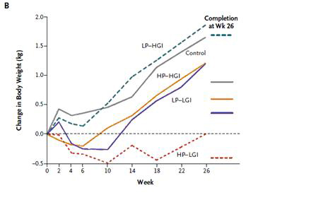 Skupina s vysokým obsahem bílkovin ve stravě s nízkým glykemickým indexem byla jediná, která si udržela svoji váhu po první ztrátě 11kg hmotnosti, tj. znovu již nepřibrala. Pro srovnání, ti ve skupině s nízkým obsahem bílkovin s vysokým GI přibrali v průměru o 1,67kg.