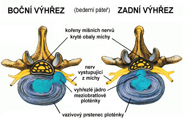 - Směrem do páteřního kanálu (zadní výhřez), což je nejvážnější stav, kdy nucleus pulposus tlačí přímo na míchu.