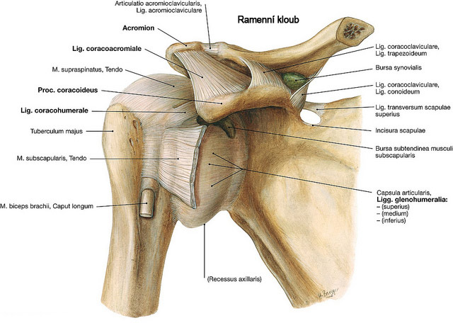 Ligamenta glenohumeralia, které jdou po povrchu kloubního pouzdra. Jsou tři – nahoře, na přední straně a dole. Ligamentum coracohumerale jde na přední straně kloubu z dalšího výběžku lopatky (processus coracoideus) o něco dále na pažní kost. Nad samotným kloubem je rozepjato ligamentum coracoacromiale, které jde mezi oběma již výše zmíněnými výběžky lopatky (acromion a processus coracoideus). Nazývá se též klenba pažní (fornix humeri), neboť zabraňuje upažení (abdukci) paže na horizontálu. (Kloubem také prochází šlacha dlouhé hlavy dvojhlavého svalu pažního – více u svalů.)