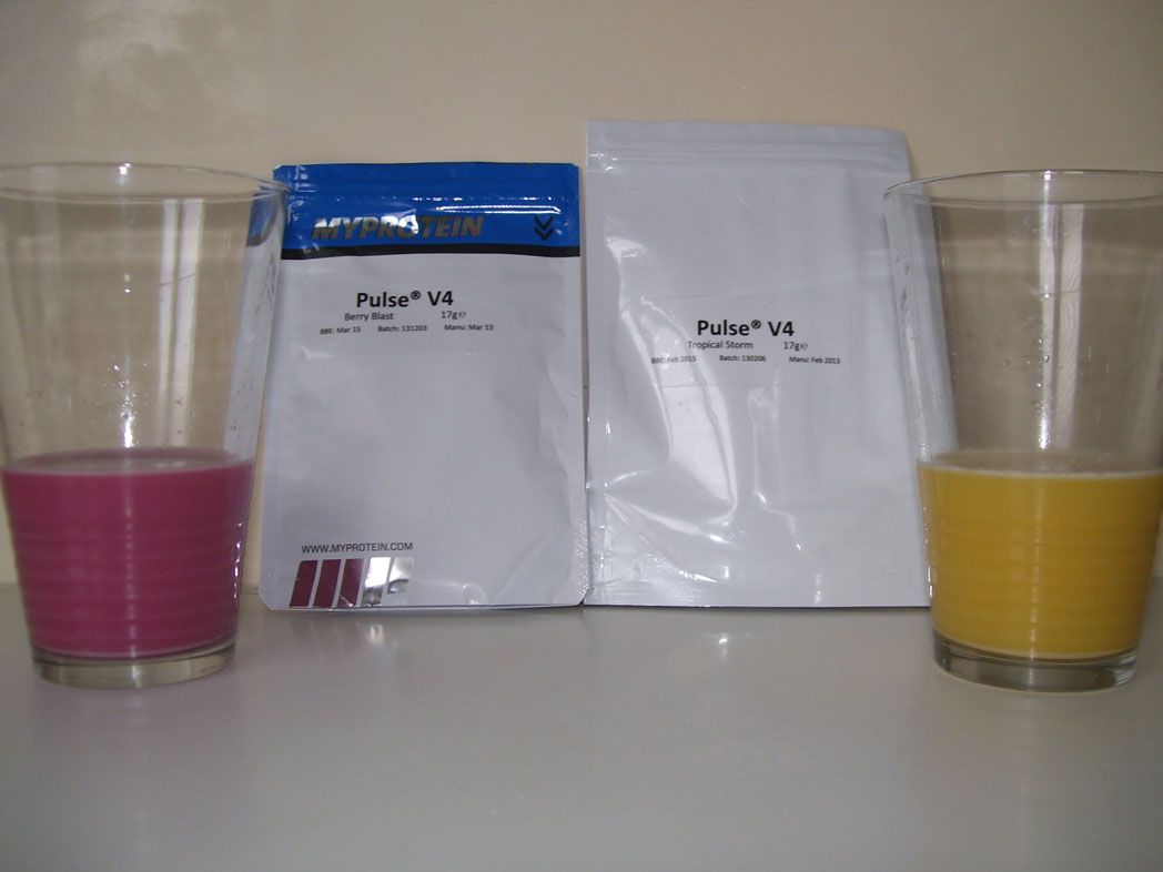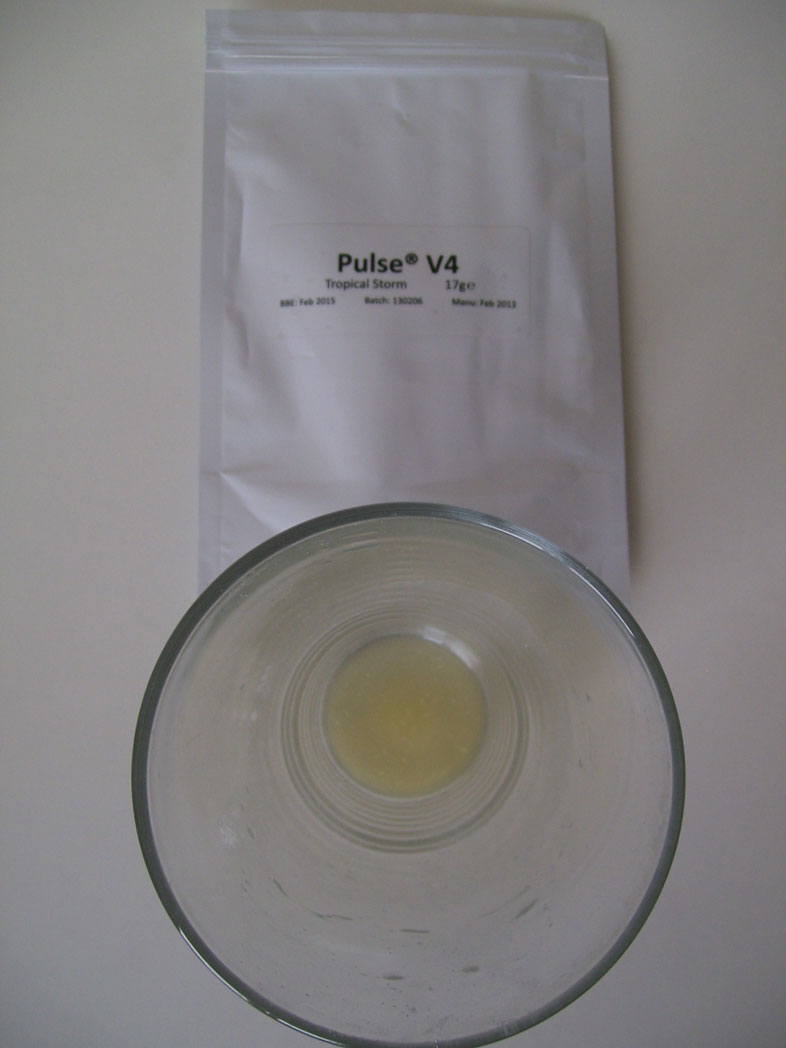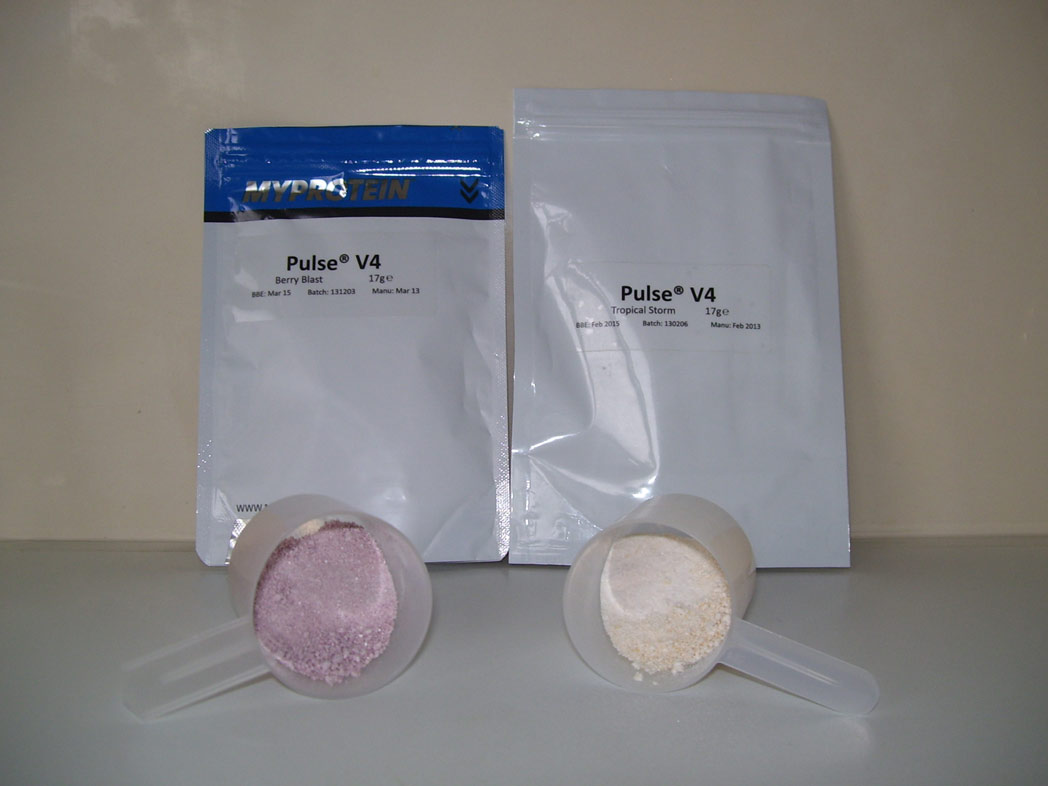 Pulse V4 je dodáván v plastovém obalu, který je možné po otevření opět jednoduše uzavřít. Prodává se pouze v jedné gramáži (pokud nepočítáme vzorky, ty jsou 17 gramové) a sice 500g. Příchutě jsou k dispozici dvě – Tropical Storm a Berry Blast.