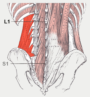 Začíná od zadní horní hrany pánve a upíná se na poslední žebro (jeho část přilehlou páteři). Jeho funkce je opět jednoduchá – při oboustranné kontrakci zaklání bederní páteř, při jednostranné kontrakci ji uklání na kontrahovanou stranu.
