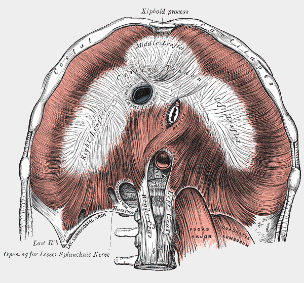Kostální část začíná od spodních žeber a sternální od hrudní kosti (sternum).