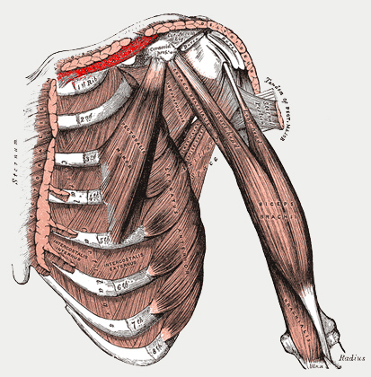 Je malý sval mezí klíční kostí (clavicula) a 1. žebrem, které je pod ní. Táhne klíční kost dolů, ale jeho funkce není nijak výrazná. Opět se samostatně neposiluje.