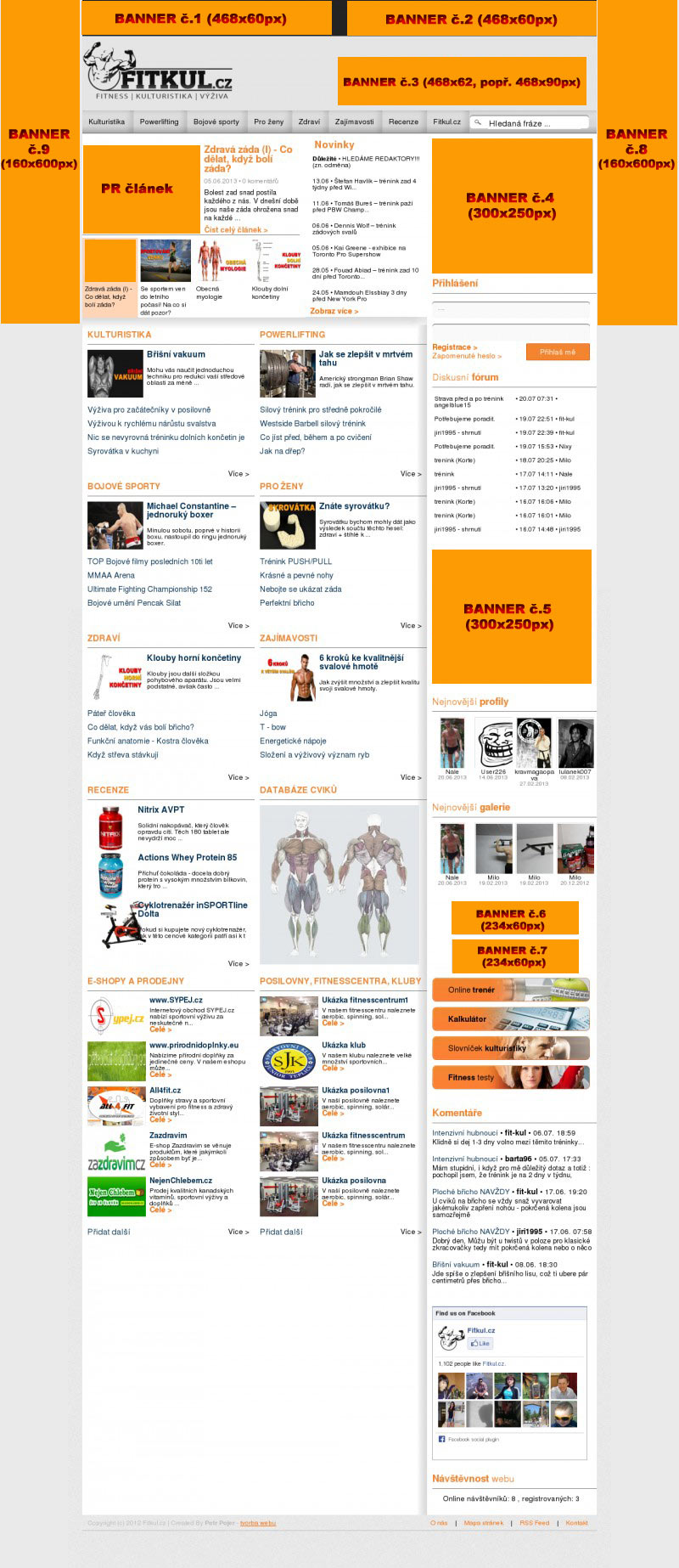 Nabízíme Vám možnost umístění Vaší reklamy na stránkách internetového magazínu www.fitkul.cz. V současné době navštěvuje tento internetový magazín cca 900 návštěvníků denně, kteří si zobrazí v průměru 2400 stránek. Pravidelné zvyšování počtu návštěvníků a registrovaných uživatelů neustále roste, což je zajištěno především díky pravidelnému zveřejňování článků z oblastí kulturistika, fitness, powerlifting, bojové sporty a zdraví, avšak nezapomínáme ani na čtenářky, které mají i vlastní kategorii Pro ženy.
